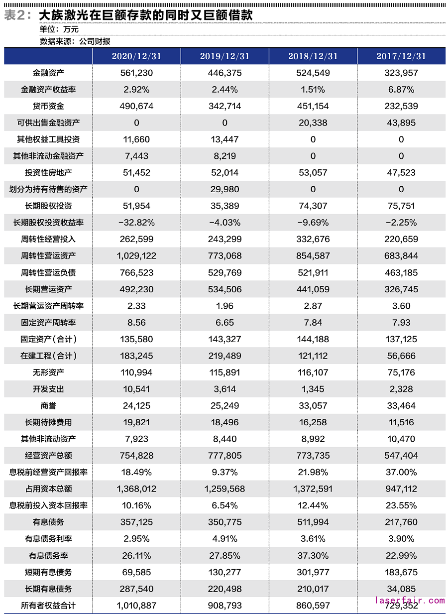 為什么會(huì)出現(xiàn)這種情況?我們把大族激光最近幾年的財(cái)務(wù)報(bào)表進(jìn)行了調(diào)整,可以看到,大族激光在2020年的金融資產(chǎn)為561230萬元,有息債務(wù)為357125萬元,并且有息債務(wù)利率高于金融資產(chǎn)收益率。也就是說,大族激光向債權(quán)人借了357125萬元,卻在銀行存款存了490674萬元,同時(shí)有51452萬元的投資性房地產(chǎn)在收取租金,還有11660萬元的其他權(quán)益工具投資。一個(gè)簡單的問題是:大族激光為什么要在巨額存款的同時(shí)去巨額借款?建議公司要處理好融資和資金需求之間的關(guān)系,做好籌劃,避免出現(xiàn)“三高”現(xiàn)象;同時(shí),對投資性房地產(chǎn)之類的資產(chǎn),要詳細(xì)分析其租金收益率情況,處理低收益資產(chǎn),提升高收益資產(chǎn)的比例。