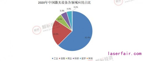 其中,工業應用激光設備規模為432.1億元,占比62.4%,信息、商業、科研、醫學領域分別占比22.0%、6.0%、5.0%、4.4%。