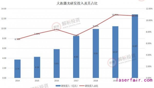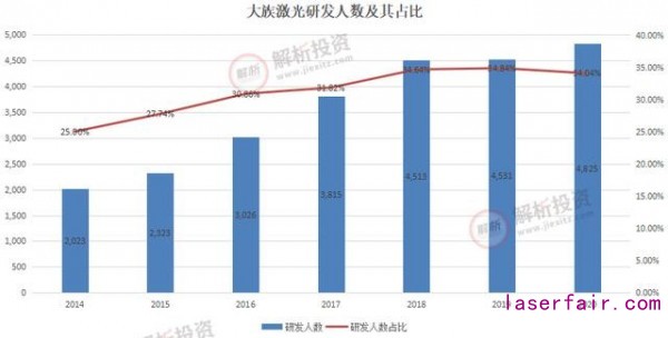 跟同行業可比公司對比來看,2019年大族激光在研發投入及研發投入占比上均遙遙領先,體現出公司強大的研發實力。