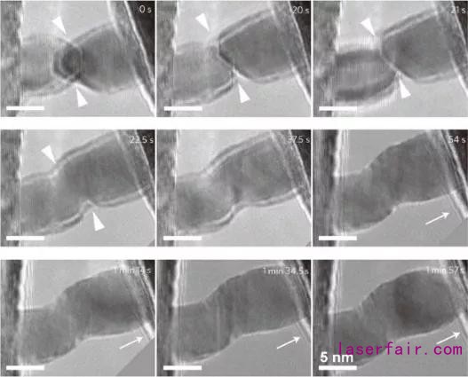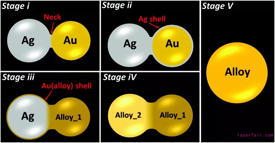 采用原位TEM觀測Ag-Au納米顆粒的激光誘導互連過程,通過視頻和圖像對互連過程實現可視化顯示,這有助于揭示Au-Ag互連結構演變的更多細節。由于大的曲率差異和顆粒間隙處的“熱點”效應,Au與Ag納米顆粒通過頸部形成互連在一起,而燒結頸的大小隨時間增長,導致兩個納米顆粒的總表面積減少。Au-Ag的納米顆?;ミB可分為五個階段:(i)頸部形成,(ii)Ag-殼形成,(iii)Au-殼形成,(iv)合金二聚體的形成和(v)均質合金納米顆粒的形成,如圖5所示。在互連過程中形成了四個不同的結構,即Ag-Au二聚體,Ag-Au@Ag二聚體,Ag@Au-Ag/Au二聚體和Ag/Au合金二聚體。