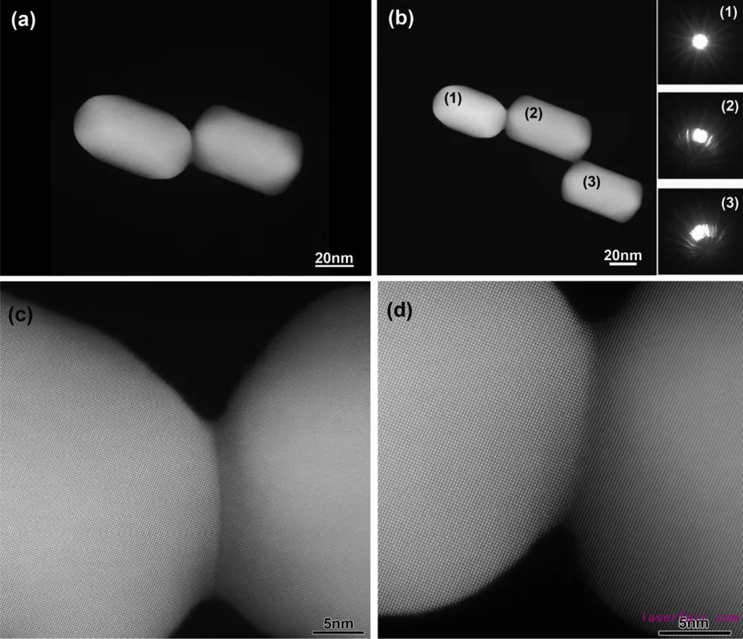 異質納米材料與同質納米尺度材料的互連過程具有相同的擴散機制,但異質材料互連的另一個挑戰就是界面的晶格匹配。圖4是在溶液介質中采用超快激光輻照Ag與Pt納米顆粒時,處于中間位置的Ag顆粒首先發生熔化并與周圍的Pt顆粒進行互連,從而使Ag顆粒充當金屬釬料,以填充相對高熔點的Pt間的間隙,實現等離子體激元輔助的激光納米釬焊過程。納米釬焊界面Pt-Ag和Ag的界面顯示了很好的晶格匹配,界面并未觀測到晶格失配。