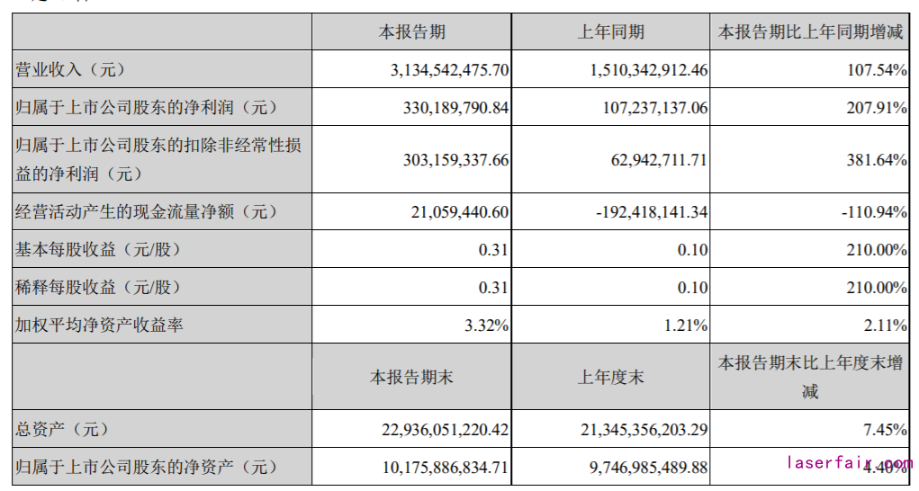 4月19日晚間,大族激光發布2021 年第一季度報告,報告期內,公司期內營業收入為31.345億元,同比增長107.54%。歸屬于上市公司股東的凈利潤3.3億元,同比增長207.91%。歸屬于上市公司股東的扣除非經常性損益的凈利潤為3.03億元,同比增長381.64%。基本每股收益0.31元。