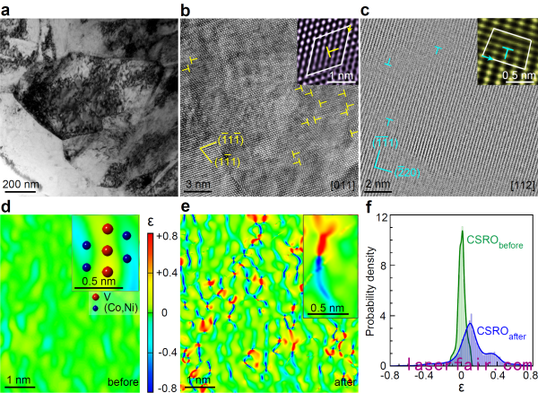 圖3.化學(xué)短程有序與位錯的交互作用以及拉伸變形前后短程有序區(qū)域應(yīng)變演化