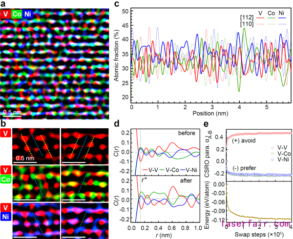 處存在超點(diǎn)陣衍射,選區(qū)和傅氏變換衍射譜中超點(diǎn)陣衍射都是直徑較大的暈圓(diffuse disk),表明在正空間所對應(yīng)的結(jié)構(gòu)是三維尺度非常小的顆粒,即CSRO區(qū)域。利用超點(diǎn)陣衍射的能量過濾暗場像與HAADF高分辨圖像的反傅氏變換成像,都觀察到均勻分布的CSRO,平均尺寸為0.5 nm,面積分?jǐn)?shù)為20%。其次,元素面分布測試表明,CSRO在相鄰{113}面上具有富V/富(Co/Ni)/富V三明治式的元素分布和占位特征。結(jié)合原子占位分析和點(diǎn)陣應(yīng)變的原子尺度幾何相分析(GPA),給出了CSRO周期性晶格應(yīng)變以及正空間的晶體結(jié)構(gòu)。第三,設(shè)計并利用空間分布關(guān)聯(lián)系數(shù)來分析在不同距離時元素間傾向于聚集(相關(guān)系數(shù)為正)還是互斥(負(fù)),發(fā)現(xiàn)相鄰原子柱中V-V傾向于規(guī)避,而V-Co和V-Ni傾向于相鄰,證實(shí)了在(111)面上傾向于形成富V-貧V(即富Co/Ni)-富V的排列。進(jìn)一步通過構(gòu)建主動學(xué)習(xí)(active learning)團(tuán)簇展開(cluster expansion)模型及其蒙特卡洛模擬,研究人員發(fā)現(xiàn),V-V規(guī)避和V-Co/Ni近鄰可降低能量是CSRO形成的驅(qū)動力。此外,GPA應(yīng)變圖譜證實(shí)了拉伸變形過程中CSRO與位錯發(fā)生強(qiáng)烈交互作用,表明CSRO對塑性變形和強(qiáng)化、應(yīng)變硬化的重要貢獻(xiàn)。
