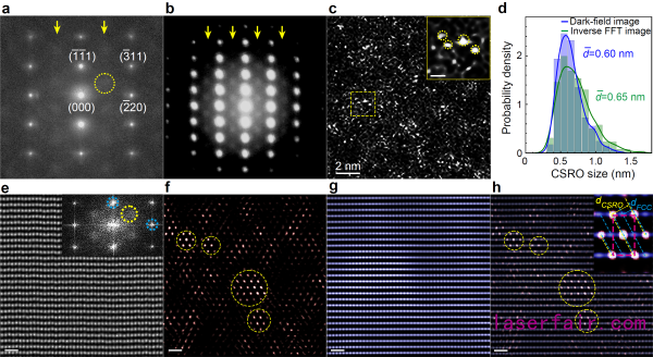 研究人員從三方面觀察并證實(shí)了CSRO的存在。首先,在面心立方VCoNi中熵合金[112]晶帶軸的選區(qū)、微區(qū)及HAADF高分辨傅氏變換的衍射譜中,均顯示在
