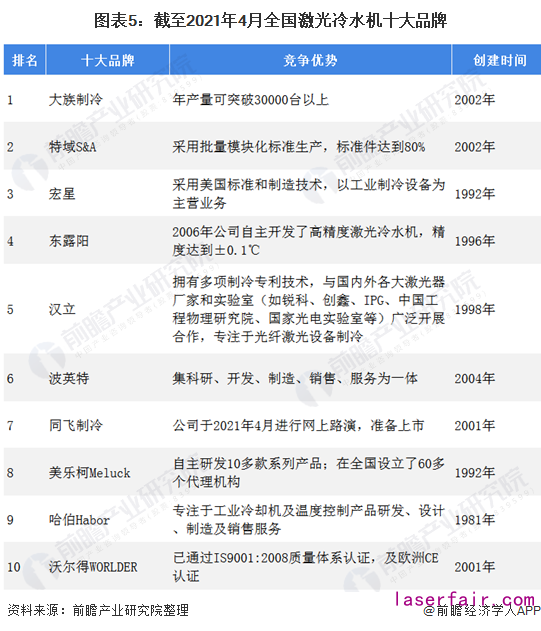 截至2021年4月,全國激光冷水機十大品牌包括大族制冷、特域S&A、宏星、東露陽、漢立、波英特、同飛制冷等,多為國產品牌,我國在冷水機市場中占據話語權有利于超快激光發展。