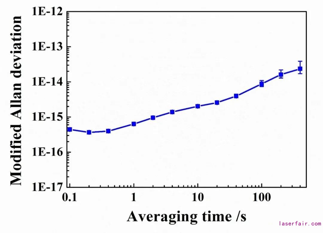 圖3 穩頻激光頻率不穩定度的修正的艾倫方差