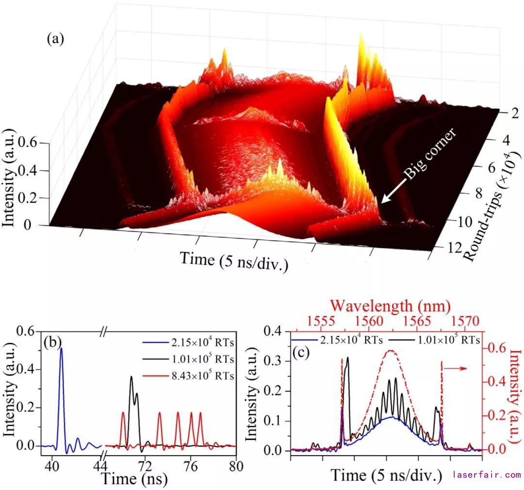 當(dāng)泵浦功率提高到較高水平時(shí),光纖激光器在腔內(nèi)可以產(chǎn)生多個(gè)光脈沖。這些多脈沖是由噪聲種子調(diào)制不穩(wěn)定性產(chǎn)生的,這種不穩(wěn)定性會(huì)導(dǎo)致不穩(wěn)定的分裂和脈沖分裂。相鄰脈沖之間的引力會(huì)導(dǎo)致脈沖群的形成,如穩(wěn)定的束縛態(tài)、不穩(wěn)定的脈沖束甚至孤子雨。相反,它們之間的斥力通常會(huì)驅(qū)使脈沖彼此遠(yuǎn)離,從而導(dǎo)致整個(gè)腔中的脈沖分布不均勻或不均勻。被動(dòng)鎖模激光器中產(chǎn)生的諧波鎖模歸因于脈沖通過聲波效應(yīng)、腔中輻射的非孤子分量(即色散波或連續(xù)波)以及增益損耗和恢復(fù)機(jī)制引起的脈沖長(zhǎng)程相互作用。被動(dòng)諧波鎖模現(xiàn)象已在鎖模激光器的各種理論和實(shí)驗(yàn)結(jié)構(gòu)中得到證實(shí),1993年報(bào)道了285次諧波的諧波鎖模激光器。通常情況下,諧波鎖模是在最終穩(wěn)定狀態(tài)下測(cè)量的,一些理論模型是建立在現(xiàn)象學(xué)假說(shuō)的基礎(chǔ)上的。Gordon和Gat提出了一個(gè)統(tǒng)計(jì)力學(xué)模型,認(rèn)為熵是鎖模理論的重要組成部分。到目前為止,被動(dòng)諧波鎖模的整個(gè)形成過程還沒有詳細(xì)的報(bào)道。諧波鎖模形成過程的起源尚不清楚,也沒有令人滿意的理論描述來(lái)揭示諧波鎖模運(yùn)行的內(nèi)在機(jī)制。