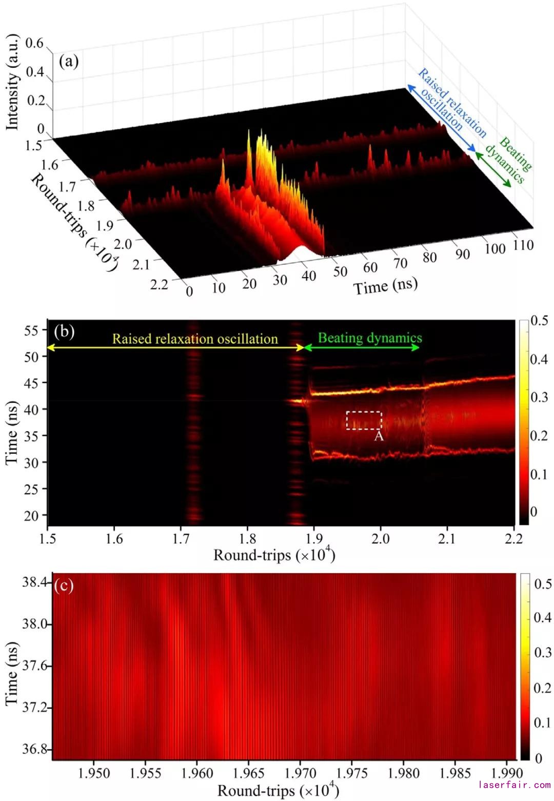 圖3 通過時(shí)間拉伸色散傅里葉變換技術(shù)捕獲諧波鎖模建立的早期階段,對(duì)應(yīng)于 1.5×104 到 2.2×104 個(gè)往返數(shù)。 注意,只有噪聲背景出現(xiàn)在 1.5×104 往返數(shù)之前。 (a) 強(qiáng)度分布 (z 軸)隨腔內(nèi)時(shí)間( x 軸)和往返數(shù)( y 軸)的變化而變化。被動(dòng)諧波鎖模的發(fā)生包括升高的弛豫振蕩和拍頻動(dòng)力學(xué)。在上升弛豫振蕩過程中有兩個(gè)激光尖峰,每個(gè)激光尖峰包含大量的脈沖。( b) (a) 的俯視圖。( c) (b) 的 A 區(qū)數(shù)據(jù)的特寫,揭示了拍動(dòng)動(dòng)力學(xué)的干涉圖樣。