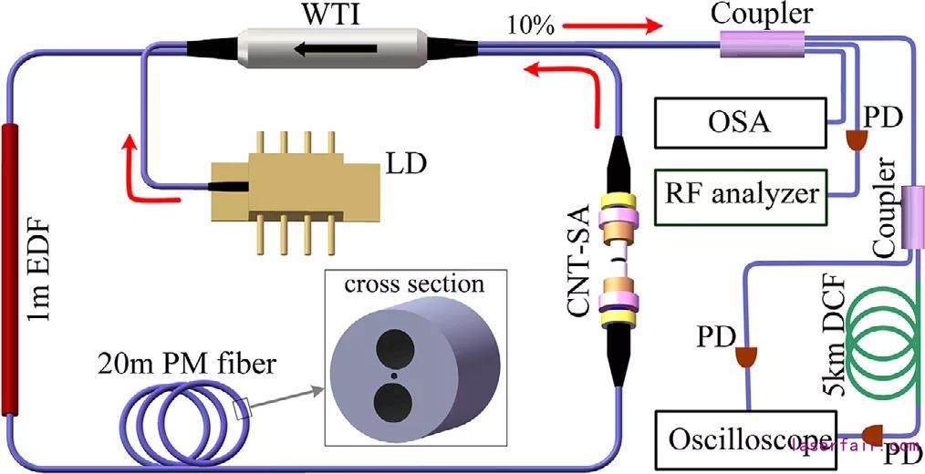 圖1 鎖模激光器實(shí)驗(yàn)裝置示意圖(左側(cè))及其超快特性線(右側(cè))。 定時(shí)數(shù)據(jù)和實(shí)時(shí)光譜數(shù)據(jù)分別通過直接檢測(cè)和檢測(cè)前在 5 km 色散補(bǔ)償光纖 (DCF) 中色散實(shí)現(xiàn)。插圖:保偏光纖的橫截面。 EDF ,摻鉺光纖; LD ,激光二極管; CNT-SA ,碳納米管可飽和吸收體; WTI ,波分復(fù)用器、抽頭耦合器和隔離器的混合組合器; OSA ,光譜分析儀; RF ,射頻; PD ,光電探測(cè)器。