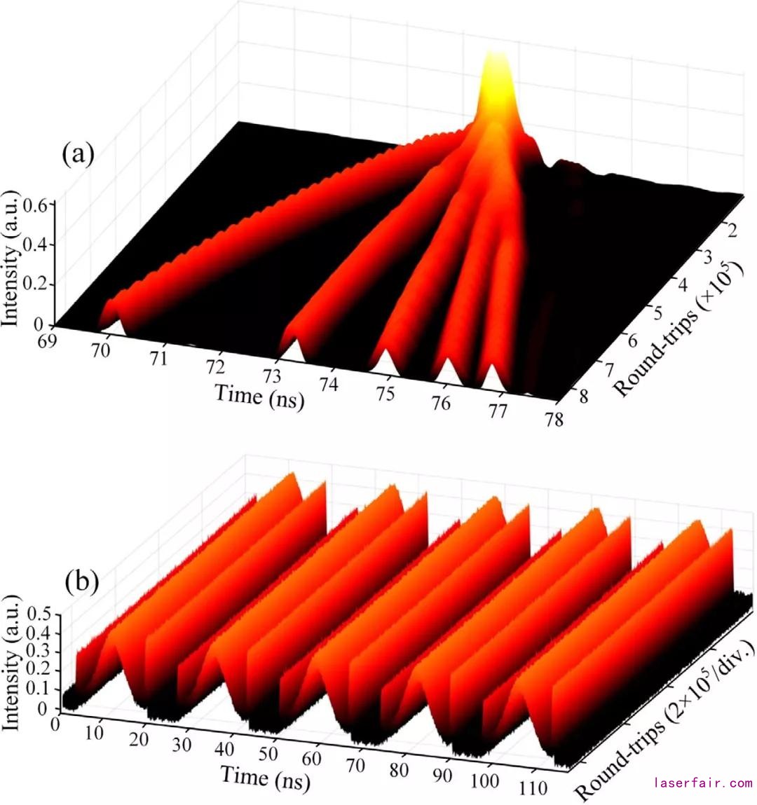 為了揭示諧波鎖模建立過程中脈沖演化的潛在機(jī)制,圖2a中局部區(qū)域的特寫被重新繪制到圖6。三維圖片展示了五個(gè)脈沖之間的排斥和分離(圖6a),顯示了脈沖是一個(gè)接一個(gè)地分離的。例如,第一、第二、第三和第四脈沖分別在約1.5×105,2.5×105,3.8×105和4.8×105個(gè)腔往返處與脈沖組分離。注意,在這一階段實(shí)驗(yàn)觀察到了周期為2.1×104個(gè)腔往返的呼吸動(dòng)力學(xué),這與之前的報(bào)告類似。圖6b是從圖2b中間圖的數(shù)據(jù)中重新繪制的三維圖片,顯示了泵浦啟動(dòng)大約5分鐘后穩(wěn)定的第五階諧波鎖模的演變。這五個(gè)脈沖的間距為23.46 ns,是等距的,它們可以穩(wěn)定地穿過激光腔而不發(fā)生呼吸現(xiàn)象。實(shí)驗(yàn)觀察表明,連續(xù)的開/關(guān)可以產(chǎn)生相當(dāng)相似的演化過程,達(dá)到相同的穩(wěn)定諧波鎖模態(tài),有7個(gè)典型階段,如圖2c所示,而詳細(xì)的演化軌跡可能會(huì)有所不同。因此,呼吸模式出現(xiàn)在諧波鎖模形成的早期階段(圖6a)而在穩(wěn)定的諧波鎖模狀態(tài)下沒有呼吸模式出現(xiàn)(注意,與脈沖持續(xù)時(shí)間相比,脈沖之間的間隔相當(dāng)大)(圖6b)。