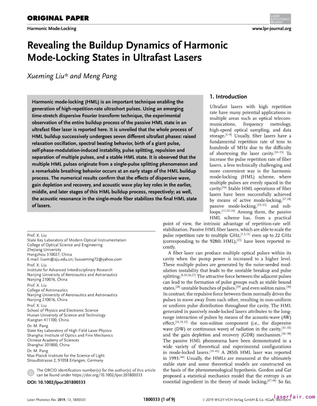 Xue-Ming Liu and Meng Pang, Revealing the Buildup Dynamics of Harmonic Mode‐Locking States in Ultrafast Lasers, Laser & Photonics Reviews 13(9): 1800333 (2019).