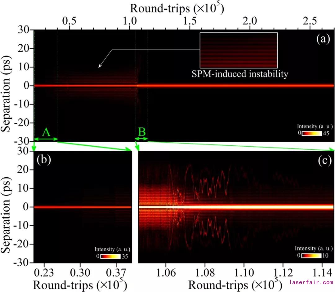 圖5a說(shuō)明了圖2b中每個(gè)單激發(fā)光譜的傅里葉變換,對(duì)應(yīng)于瞬時(shí)脈沖的自相關(guān),其跟蹤脈沖之間時(shí)間間隔的演變。圖5b和5c分別是圖5a中A和B區(qū)域的放大圖。圖5b揭示了從大約0.2×105到0.3×105腔往返的腔中只存在單個(gè)脈沖(例如,圖4b,c中藍(lán)色曲線),隨后,自相位調(diào)制引起較弱的調(diào)制不穩(wěn)定性。自相位調(diào)制引起的不穩(wěn)定性逐漸增加,直到1.06×105 腔往返(圖4b,c中黑色曲線),最終導(dǎo)致脈沖分裂,產(chǎn)生五個(gè)脈沖,如圖5c所示。圖5c顯示,從1.06×105至1.13×105 腔往返開始的過程中產(chǎn)生了多個(gè)脈沖,對(duì)應(yīng)于大轉(zhuǎn)角附近的區(qū)域(圖2和4)。從0.3×105到1.06×105腔往返開始記錄的自相位調(diào)制引起的不穩(wěn)定性是產(chǎn)生多個(gè)腔內(nèi)脈沖的關(guān)鍵階段。圖5a顯示了多個(gè)脈沖在1.13×105腔往返以上區(qū)域的演化軌跡與單脈沖在0.2×105至0.3× 105腔往返范圍內(nèi)的演化軌跡相似。