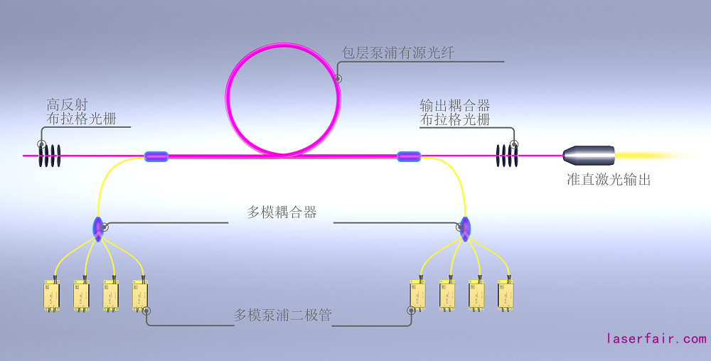 這個(gè)光學(xué)腔將低質(zhì)量的二極管光轉(zhuǎn)換為單模激光光束。其中一個(gè)光纖布拉格光柵作為全反射器,另一個(gè)作為部分反射器或輸出耦合器。多模包層中沒(méi)有摻雜其他元素,作用只是散發(fā)二極管泵浦光。光纖激光器的固態(tài)結(jié)構(gòu),使它不受灰塵、水分和自由空間空氣擾動(dòng)等環(huán)境因素的影響。