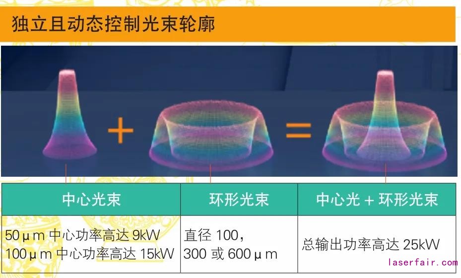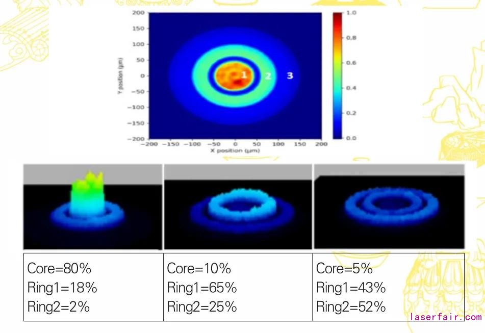 各激光器廠商從光束著手,推出了光束可調(diào)技術(shù),具有代表性的是IPG的AMB激光器(產(chǎn)生的光束如圖2所示)和Nlight的Corona激光器。通過調(diào)節(jié)光束模式,產(chǎn)生一個更大更穩(wěn)定的匙孔,環(huán)形光束(圖3)使材料軟化,并朝熔池底部偏轉(zhuǎn),減少焊接飛濺及氣孔,有效提升了鋁合金材質(zhì)的焊接質(zhì)量與效率。