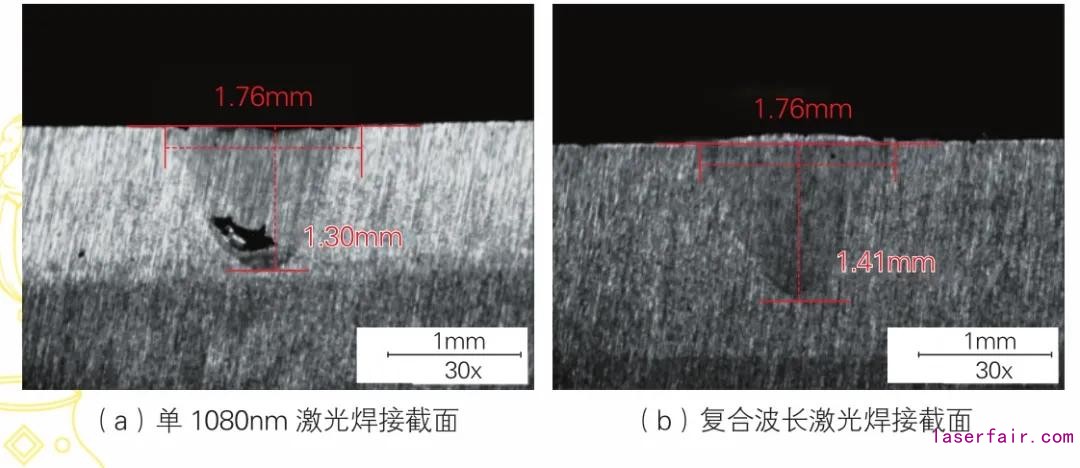 復(fù)合光源焊接金屬材料時,主光源光纖激光針對母材進行深熔焊,半導(dǎo)體激光作為次波段光源同步預(yù)熱材料并增加其熔融狀態(tài)的時間,有助于抑制焊接熱裂紋和焊接內(nèi)部氣孔的產(chǎn)生,同時提高焊接小孔的穩(wěn)定性,如圖6所示。另外,半導(dǎo)體激光能夠大大增加母材對激光的吸收率,在銅鋁等高反材料的焊接上具有很大優(yōu)勢。