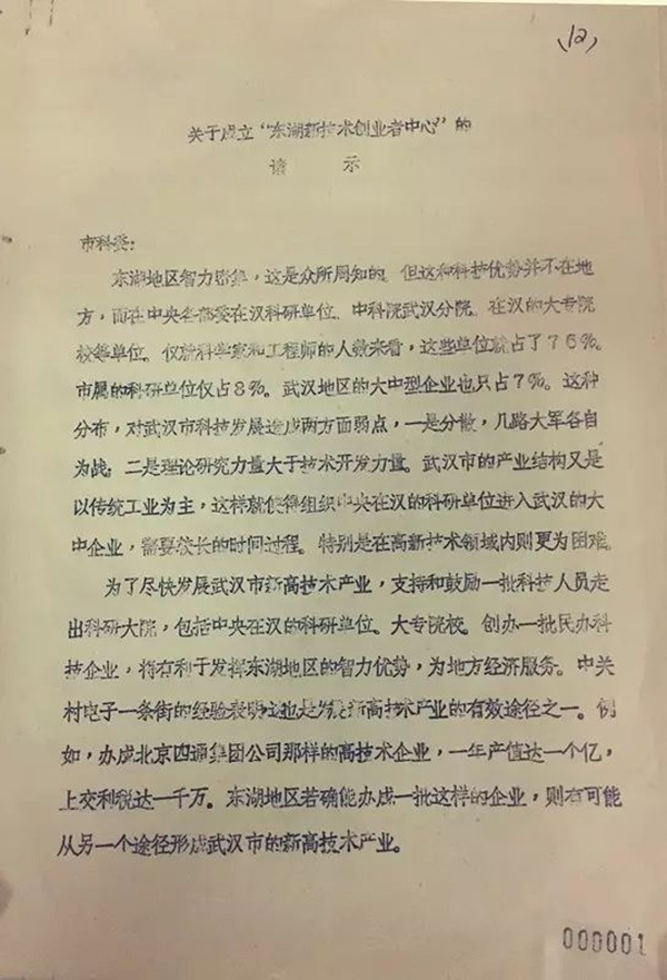 1987年,為了給科技創(chuàng)業(yè)撐起“保護傘”,尚在籌備階段的東湖新技術開發(fā)區(qū)向武漢市科委遞交了一份關于成立“東湖新技術創(chuàng)業(yè)者中心”的請示報告。