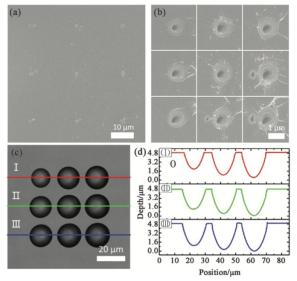 藍寶石作為一種具有極高硬度、寬光譜透過率和極其穩定的化學性質的透明硬質材料,在工業和國防領域具有廣泛的應用潛力,其在微光學領域也具有極高的潛在應用價值。根據上節飛秒激光制備石英微凹透鏡的加工機理,各向同性的濕法刻蝕是實現高表面質量微凹透鏡的關鍵。這里借助飛秒激光燒蝕種子結構結合各項同性濕法刻蝕的思想,將其應用到藍寶石微透鏡的加工中,實現藍寶石微凹透鏡陣列的高效率制備。
