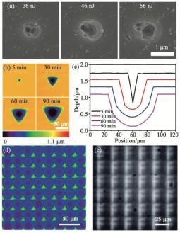 這里采用的是C相藍寶石,使用不同單脈沖能量直接燒蝕得到的結果如圖 7(a)所示。利用該高溫化學反應,單脈沖能量為36 nJ燒蝕后的藍寶石結構隨刻蝕時間的演化過程如圖 7(b)所示。當在溶液中刻蝕5 min以后,藍寶石表面的燒蝕微坑已經擴大并演變成倒三棱錐結構,并且隨著刻蝕時間增加。藍寶石表面微結構的整體尺寸也逐漸增加,但是從側面圖 7(c)可以看到,在整個刻蝕過程中,其斜邊的傾斜角度保持不變,但是底部由原來的三棱錐形狀變成了球形。并且隨著刻蝕時間的近一步增加,其底面的尺寸也隨之變大。經驗證,該底部結構具有比較完美的球面輪廓。根據這一現象,利用光場調制技術將焦點調制為4×4的點陣,焦點之間的間隔略小于刻蝕后藍寶石底部的球面直徑,可以避免由不同晶向引起的三棱柱側邊,從而實現具有高表面質量的藍寶石微透鏡陣列結構。圖 7(d)是利用飛秒激光空間光場調制和濕法刻蝕制備的大面積藍寶石微透鏡陣列結構,可以看到其尺寸分布比較均勻,且都具有比較好的成像效果(圖 7(e))。