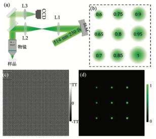 為了提高加工效率以及激光能量利用率,這里使用德國HOLOEYE反射式的液晶相位調制器(LETO-VIS-009)作為空間光場調制的手段。基于LC-SLM的并行飛秒激光加工系統如圖 2(a)所示,波長為514 nm,脈寬為230 fs的飛秒激光經過LC-SLM進行空間光場調制后,利用4f光路將調制之后的光場相位分布投影到物鏡入瞳,經過物鏡之后,在物鏡焦平面形成多個焦點,實現多點并行加工。為了提高飛秒激光的能量利用率,4f系統使用了焦距分別為400 mm和300 mm的透鏡,可以在投影的同時實現縮束效果,從而在充分利用物鏡數值孔徑的基礎上充分利用飛秒激光的能量。為了實現對多個焦點的位置和能量的準確控制,并考慮到計算的速度等問題,這里使用基于傅里葉全息的最優旋轉角算法(Optimal Rotation Angle Algorithm, ORA),其優勢在于僅通過正向傅里葉變換即可迭代得到較為理想的全息相位分布,且只需要較少的迭代次數。圖 2(b)是預先設計的3×3共計9個不同聚焦光點的能量和位置示意圖,其中點與點之間的間隔為20 μm,其相對能量數值從0.6均勻變化到1。利用ORA全息算法計算得到其相應的全息相位分布如圖 2(c)所示,其中最大和最小數值分別對應于-π和+π。隨后利用S-FFT衍射積分算法對計算得到的全息相位進行光場仿真,并得到其在焦平面的光場能量分布(圖 2(d)),計算結果與設計基本保持一致,證明ORA算法可以滿足并行加工的需求。