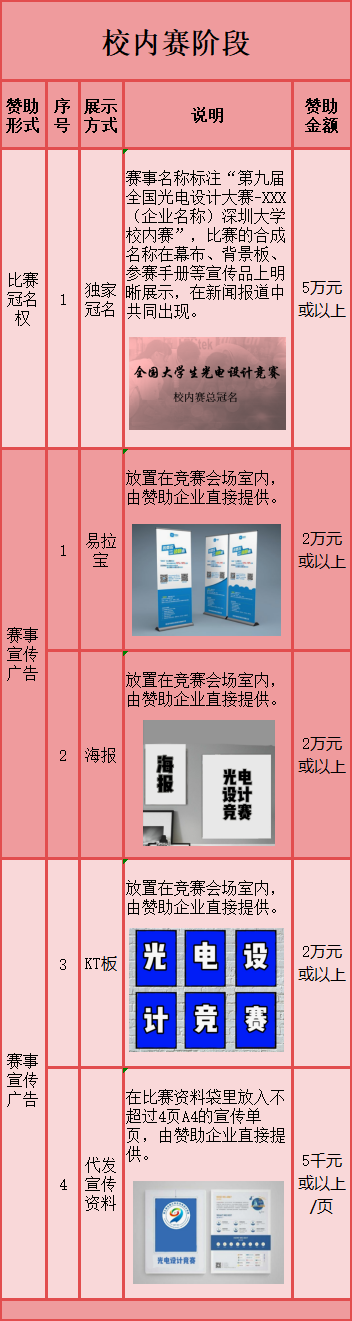 & 根據國競委關于贊助事項的相關規定,以上所有贊助形式均可標注“第九屆全國大學生光電設計競賽”字樣,可以呈現贊助單位LOGO和名稱,為體現公益性和社會性,不可出現“贊助”、“資助”等體現商業性色彩的字樣,可以有“支持”類的字樣。