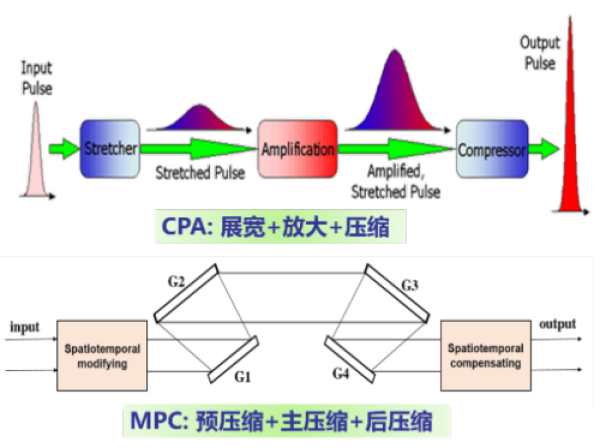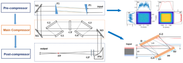 拍瓦(1015瓦,PW)超強激光在激光粒子加速乃至真空極化等前沿科學(xué)研究中有重要應(yīng)用。目前,獲得10s-100s PW超強激光的最大瓶頸是受限于壓縮光柵的尺寸與損傷閾值。2020年,科研人員利用光柵損傷閾值隨脈沖寬度增加而增加的特性,提出了“內(nèi)部分束壓縮器”[Optics Express 28(15):22978(2020)],降低了壓縮組束的難度。最近,科研人員基于前期研究,進一步考慮激光時空特性,提出了“分步壓縮器(MPC)”的新設(shè)計。新的設(shè)計思想類似啁啾脈沖放大技術(shù)(CPA),CPA是將晶體損傷矛盾轉(zhuǎn)移到激光時域來解決,通過在放大前后分別增加展寬器與壓縮器專門解決脈沖的寬度問題來實現(xiàn)。該MPC的新設(shè)計則是將壓縮光柵損傷的矛盾轉(zhuǎn)移到脈沖時空特性上,讓四光柵壓縮器的激光時空特性可實現(xiàn)最高能量的輸入輸出,并在前后增加預(yù)壓縮與后壓縮來專門解決時空特性問題。