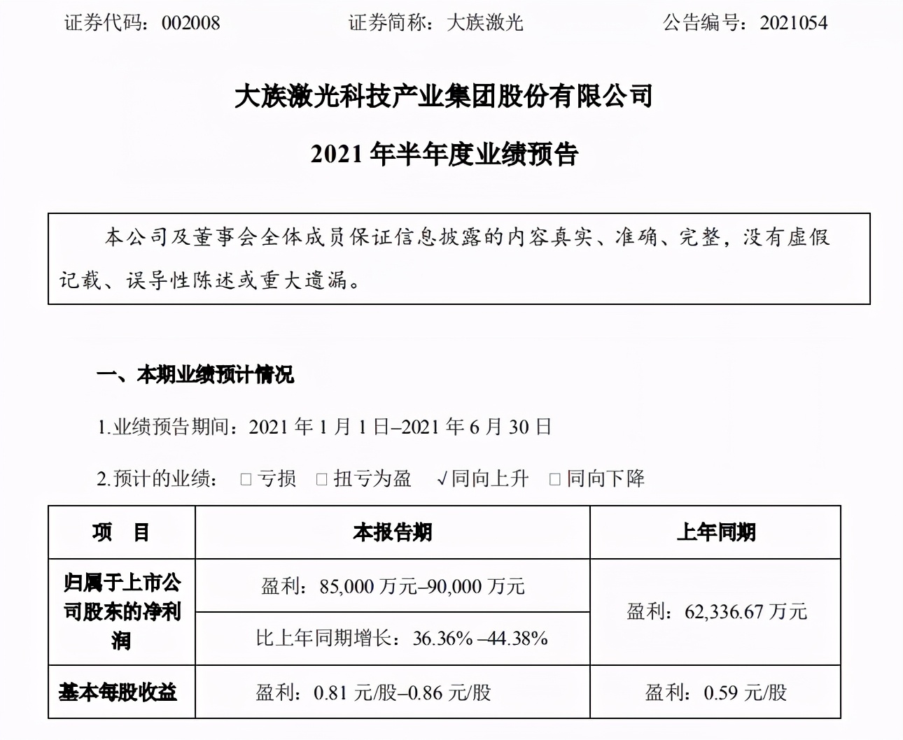 6月30日,大族激光披露了2021年半年度業績預告,預計歸屬于上市公司股東的凈利潤盈利8.5億元至9億元,比上年同期增長36.36%至44.38%,上年同期為6.23億元;基本每股收益0.81元/股至0.86元/股,上年同期為0.59元/股。