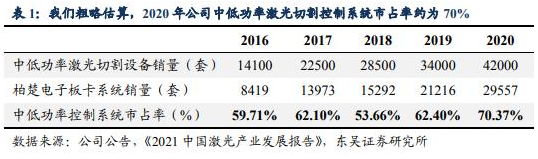 公司作為業內翹楚,是國內第一家高功率激光切割控制系統供應商,目前各項技術水平已達到國際先進水準,總線系統正處快速放量期,2019-2020年分別實現營收2375和7068萬元,同比增長348%和198%,2017-2020年CAGR高達261%。我們預估,2020年公司高功率產品的市占率約為17%,短期內市場份額已得到明顯提升(2019年約10%)。