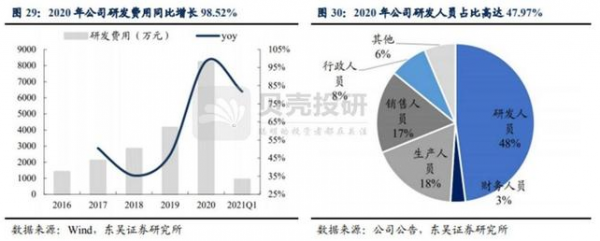 公司注重研發團隊的培養,人才優勢顯著,擁有工程師紅利:①從人員結構來看,2020年公司研發人員達到142人,占比高達47.97%;②從學歷構成上看,截至2020年底,公司研發人員中碩士及以上學歷51人,占比達到35.92%。