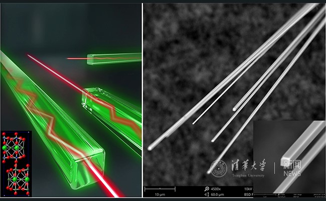 納米線波導(dǎo)實(shí)現(xiàn)光放大的示意圖(左),納米線的掃描電子顯微鏡照片(右)。