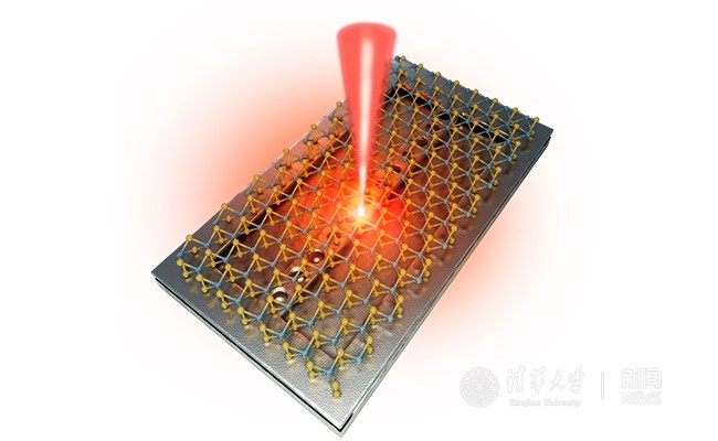 網(wǎng)狀結(jié)構(gòu)示意單層二維材料,底下是一個(gè)用作激光腔的硅納米懸臂。