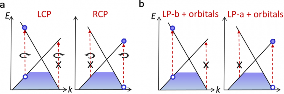 研究表明,在Weyl點附近存在由原子軌道對稱性及躍遷選擇定則所決定的載流子的選擇性激發,與通常手性激發的自旋選擇定則大為不同的是,其激發路徑可以通過改變線偏振光的極化方向及光子能量加以控制(圖2)。