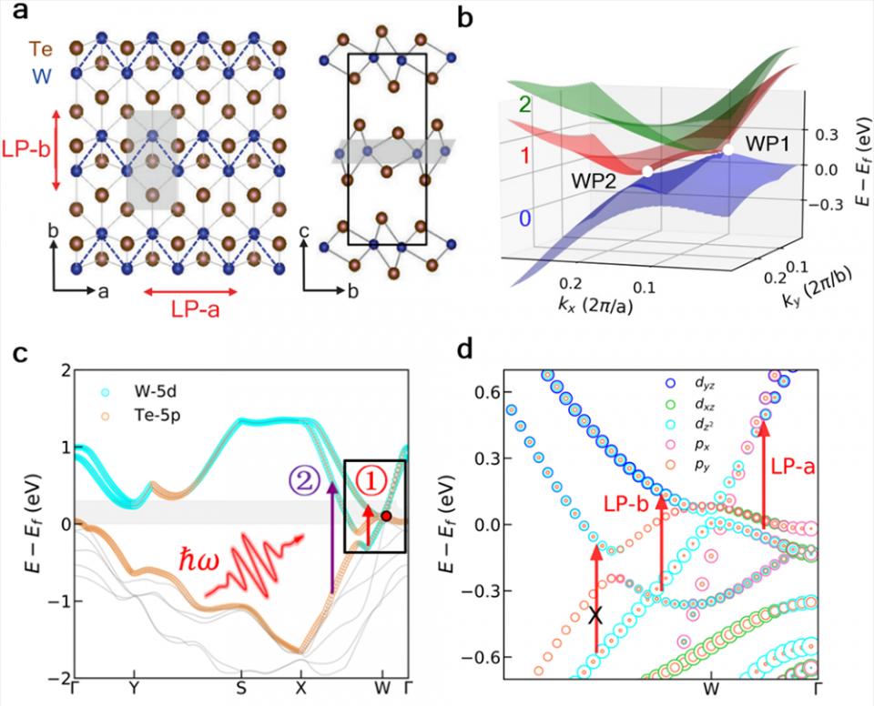 圖2. a. Td-WTe2的原子結構示意圖; b. 費米面附近的能帶結構。c. 沿著布里淵區高對稱線分布的能帶結構及原子軌道的相對貢獻。箭頭①及②分別代表靠近或遠離Weyl點的激發; d. 沿著Γ-X方向能帶結構的放大。