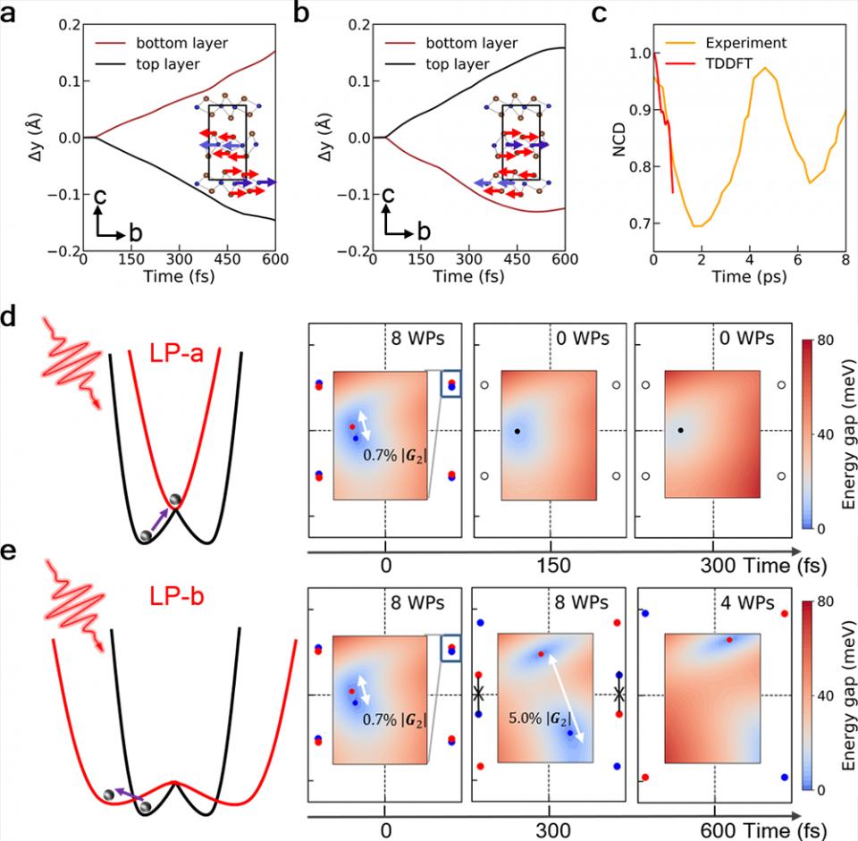 圖3. a-b, 線偏振光極化方向沿著晶體a軸及b軸的層間相對運動;插圖為相應的運動模式。c. 理論模擬與實驗觀測的比較。d-e. 體系的對稱性演化及 kz=0 平面內兩個最鄰近Weyl點的位置、數目及分離程度。
