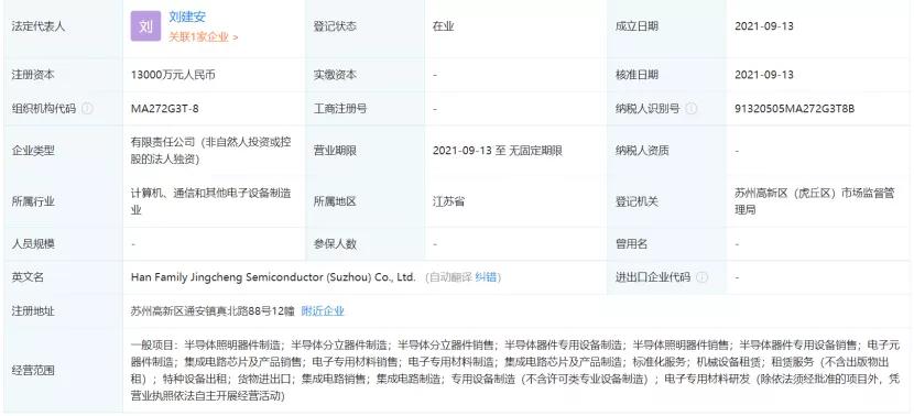 9月13日,大族精誠半導體(蘇州)有限公司成立,法定代表人為劉建安,注冊資本1.3億元人民幣,經營范圍包含:半導體器件專用設備制造;集成電路芯片及產品制造;電子專用材料研發等。據企查查股權穿透顯示,該公司由大族激光100%控股。
