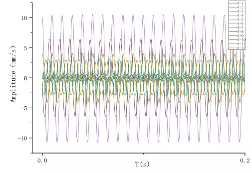 從各點的時域信號可以看出,各點的振動呈周期性穩態特性,通過頻譜圖可以看出,振動頻率主要集中在100Hz及其諧波分量。進一步地,基于采集的各點時域信號,可以對電抗器進行振動有效值分析和振動分布情況等相關分析。