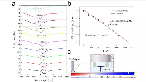 研究人員對光纖端面固支梁探針逐漸施加外力,并實時監測其反射光譜。當以300 nN 的增量從0 nN逐漸增加到2700nN時,光纖端面固支梁探針的反射光譜演變如圖3a所示,從圖中可以看出反射譜的Dip波長隨著微力的增加而逐漸藍移。Dip波長與施加力的關系如圖5b所示,利用線性擬合計算出該光纖微力傳感器的力學靈敏度高達-1.51nm/μN,成功建立了施加力和傳感器輸出之間的線性關系,完成了傳感器的微力標定。