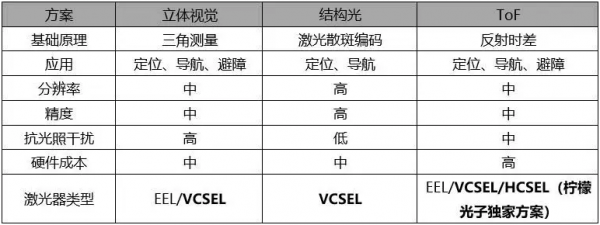 激光雷達(dá)行業(yè)技術(shù)處于生命周期初期,多維度、多元化技術(shù)創(chuàng)新不斷涌現(xiàn)。技術(shù)創(chuàng)新帶來的產(chǎn)品升級是機器視覺行業(yè)規(guī)模擴大的核心驅(qū)動力。掃地機器人是近年來增長迅猛的智能機器人領(lǐng)域。當(dāng)前在掃地機器人移動導(dǎo)航領(lǐng)域的主流技術(shù)是 SLAM (Simultaneous Localization and Mapping)即時定位與地圖構(gòu)建技術(shù)。按傳感器種類來劃分,SLAM技術(shù)主要分為兩類,一類是基于激光測距傳感器的LDS SLAM技術(shù),另一類是基于機器視覺的VSLAM技術(shù)。LDS SLAM目前為市場主流技術(shù)。表一對三種主流的LDS SLAM方案進行了對比。立體視覺方案憑借其在分辨率、測量精度、抗干擾性和成本等方面的綜合優(yōu)勢,是目前被廣泛采用的LDS SLAM方案。ToF方案的地圖構(gòu)建能力更強,但相對成本較高。結(jié)構(gòu)光方案由于測量距離受限和抗干擾性相對較弱,應(yīng)用也相對受限。在應(yīng)用相對廣泛的立體視覺和ToF方案中,傳統(tǒng)的激光雷達(dá)光源一般采用邊發(fā)射激光器 (EEL)。檸檬光子基于自主研發(fā)的高性能垂直腔面發(fā)射激光芯片(VCSEL)和水平腔面發(fā)射激光芯片(HCSEL),為主流的LDS SLAM系統(tǒng)提供性能更優(yōu)異的激光光源方案。
