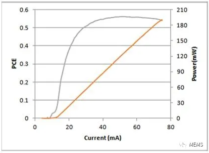 圖二:檸檬光子多結(jié)VCSEL芯片實測LI和PCE數(shù)據(jù)(測試條件:200μs脈沖寬度,1%占空比)