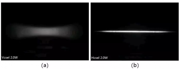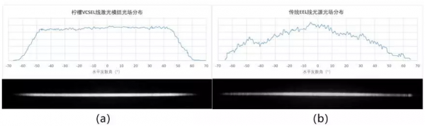 圖五:VCSEL和HCSEL芯片經(jīng)120度 x 1度diffuser的光場對比:(a)VCSEL不通過準(zhǔn)直鏡,光場無法被diffuser壓縮,光束發(fā)散,雜散光形成噪聲;(b)HCSEL直接通過diffuser便形成銳利的線光斑,線寬更窄,均勻度更好