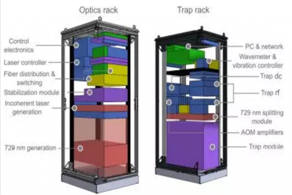 圖1:演示機的模塊布局圖。光學機柜主要包含大部分非相干光源和729nm相干光源,以及光纖分發和光開關模塊,離子阱機柜包含離子阱和進阱光路。兩個機柜之間通過光纖進行連接。兩個機柜都具備很好的機械和溫度穩定性,保證了整個系統的性能。