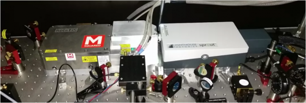 AQT的演示機系統中的729光源使用了M Squared公司的SolsTiS單頻可調諧鈦寶石激光器。與其他鈦寶石激光器類似,該激光器使用532nm綠光光源(如M Squared Equinox)泵浦Ti3+:Al2O3晶體,利用多種頻率選擇元件,獲得光譜純度較高的基模高斯激光光束。SolsTiS激光器在此基礎上,使用先進的寬帶光學元件,讓激光器具有極寬的調諧范圍(700-1000nm),使用超穩定的機械和光學設計,使得激光具有極低的自由運轉線寬(50kHz)極低的功率抖動(0.075% RMS),因此十分適合作為Ca離子阱的729nm主激光光源。