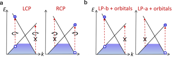 圖1.a.手性符號為正(χ=+1)的Weyl點在圓偏振光下的手性選擇定則;b. χ=+1的Weyl點在線偏振光下由于原子軌道對稱性導(dǎo)致的選擇性激發(fā)