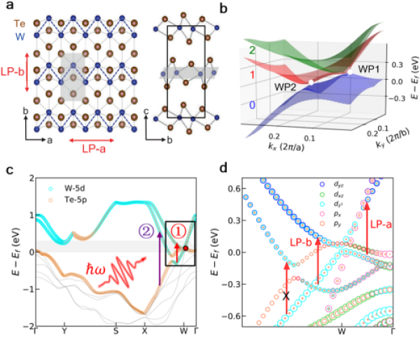 圖2.a、Td-WTe2的原子結(jié)構(gòu)示意圖;b、費米面附近的能帶結(jié)構(gòu);c、沿著布里淵區(qū)高對稱線分布的能帶結(jié)構(gòu)及原子軌道的相對貢獻(xiàn),箭頭①及②分別代表靠近或遠(yuǎn)離Weyl點的激發(fā);d、沿著Γ-X方向能帶結(jié)構(gòu)的放大