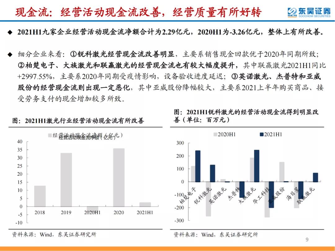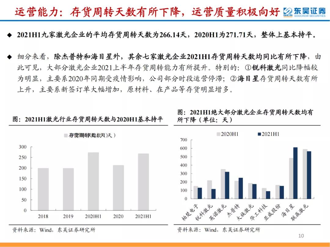 整體來看,2021H1九家激光企業合計實現營收170.90億元,同比+57.29%,合計實現歸母凈利潤20.33億元,同比+53.96%,業績保持高速增長;綜合凈利率為12.08%,同比-0.10pct,表現較為穩定;綜合毛利率為32.11%,同比-2.71pct,出現一定回落;綜合期間費用率為19.48%,同比-3.34pct,規模效應顯現;此外,經營現金流和營運能力等指標積極向好,存貨&合同負債大幅提升,將保障短期業績繼續高增長。