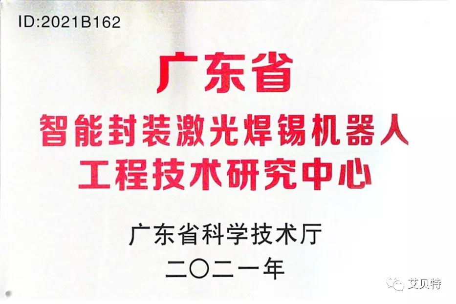 同樣在七月,深圳市艾貝特電子科技有限公司經過廣東省科學技術廳的評選,實力獲得“廣東省智能封裝激光焊接機器人工程技術研究中心”認證,為更好的科技創新打下堅實的基礎,創造更高的平臺,同時這一殊榮也是公司技術在細分領域實力的體現。