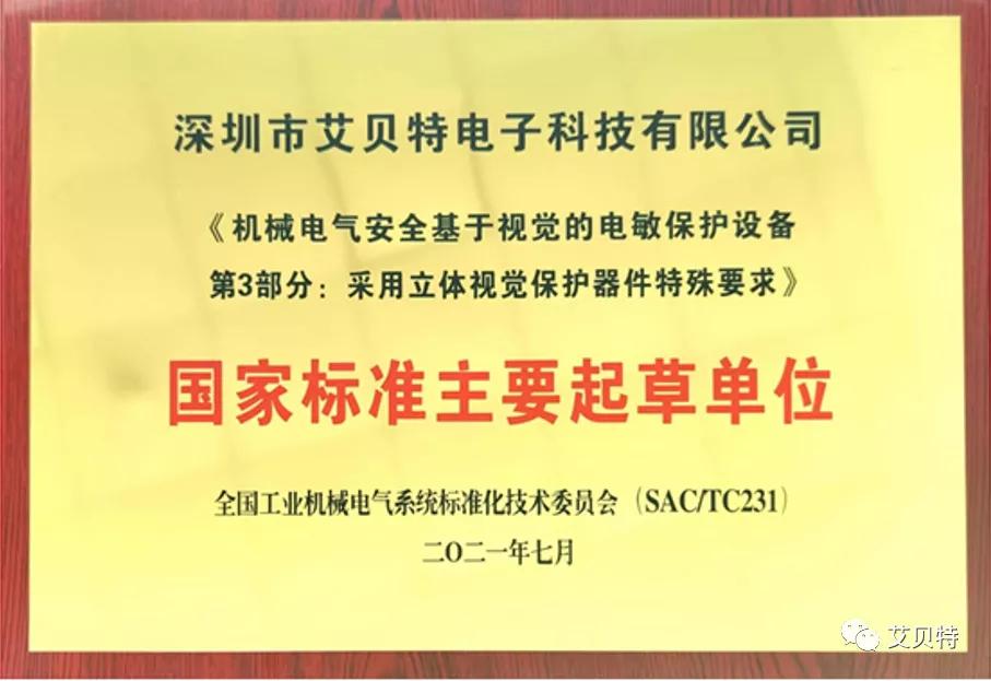 經過十多年的潛心鉆研,技術沉淀,艾貝特以自己的實力被全國工業機械電氣系統標準化技術委員會評為《機械電氣安全基于視覺的電敏保護設備第3部分:采用立體視覺保護器材特殊要求》國家標準主要起草單位。