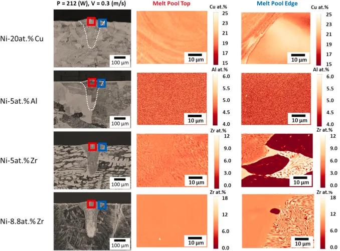 左側欄:以212瓦和0.3米/秒的速度打印的每種合金成分的單個軌跡的光學顯微照片,紅、藍色方框表示波長色散光譜圖(wavelength dispersive spectroscopy,WDS)的繪制位置。