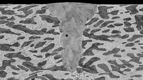 鎳鋅合金單次激光掃描橫截面的掃描電子顯微鏡圖像。深色的富鎳相交錯著具有均勻微觀結構的較輕相。在熔池結構中也可以觀察到孔隙。