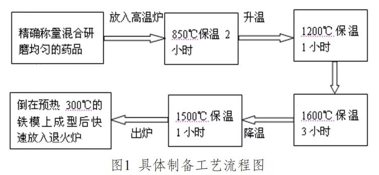硅酸鹽樣品是由傳統(tǒng)的高溫熔融技術制備的。與MCVD 溶液摻雜法相比,用高溫熔融法制備玻璃樣品,能有效提高稀土離子濃度,促進摻雜光纖大功率激光的輸出。制備過程為:首先使用電子天平精確稱重,再在瑪瑙研缽內細磨30min,使 其充分混合均勻,小心避免藥品外濺。將樣品放進預先加熱至 200℃的剛玉坩堝中,繼續(xù)在馬弗爐內預熱30min;然后放入預 熱至600℃的硅碳棒電爐,迅速升溫至850℃后保溫2h,再升溫 至1200℃保溫1h,快速加熱至1600℃保溫3h,在30min內降溫到 1500℃保溫1h;最后將其倒在預熱至300℃的鐵質模具上成型后 快速放入退火爐精確退火(5℃/min)至室溫。具體制備工藝流 程圖如圖1所示。